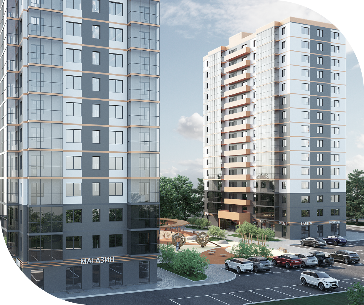 Многоэтажные жилые дома со встроенно-пристроенными торговыми помещениями и полуподземной автостоянкой: 3 блок-секции (2 очереди строительства)